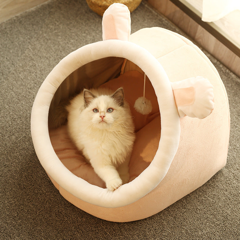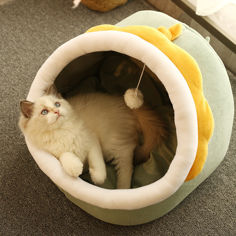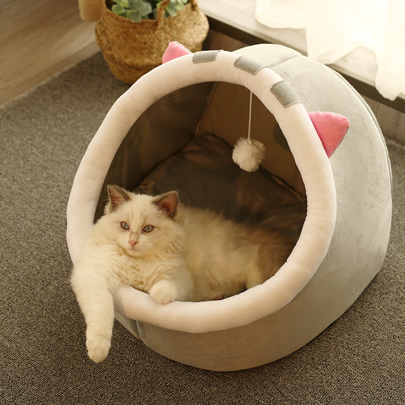 Das halbgeschlossene Katzenbett bietet deiner Katze einen sicheren, warmen und ruhigen Rückzugsort zum Schlafen und Entspannen. Die Form erinnert an eine gemütliche Katzenhöhle, in der sich auch schüchterne oder ängstliche Katzen geborgen fühlen.